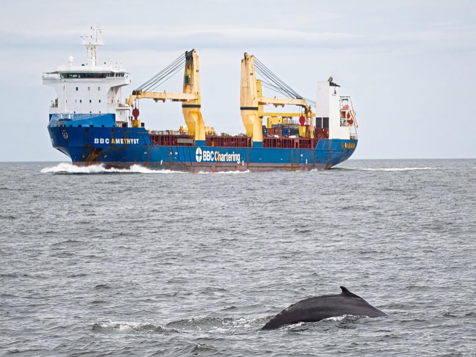 Humpback whale and cargo ship