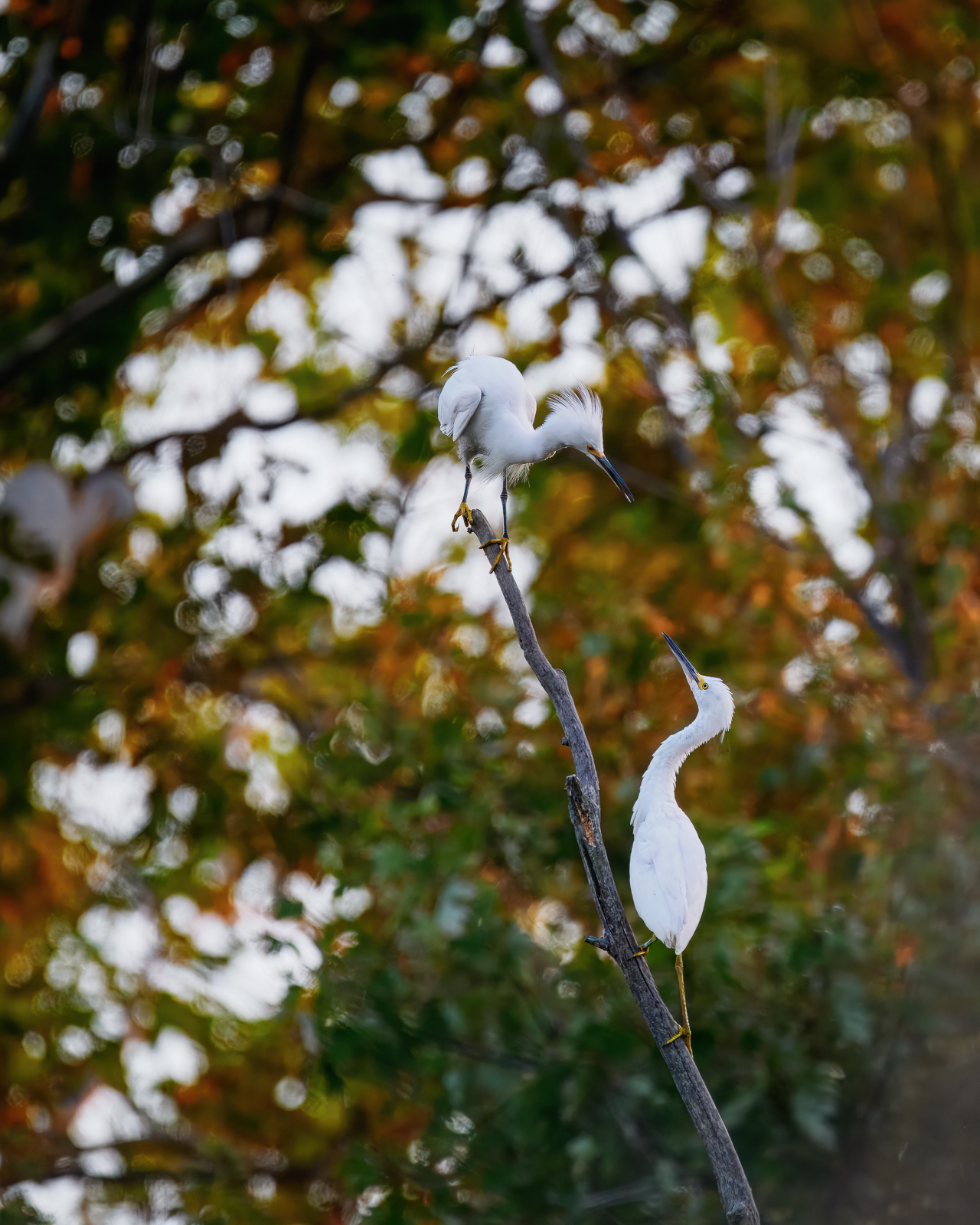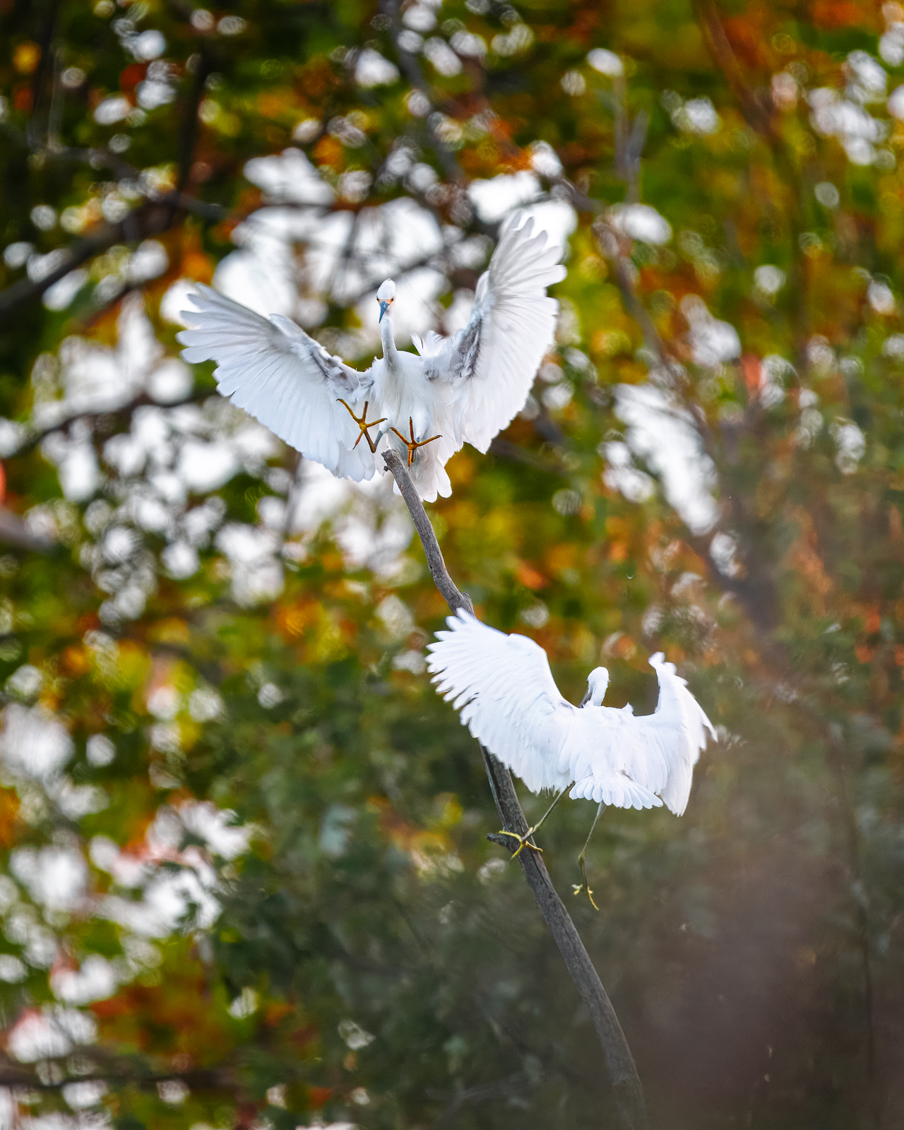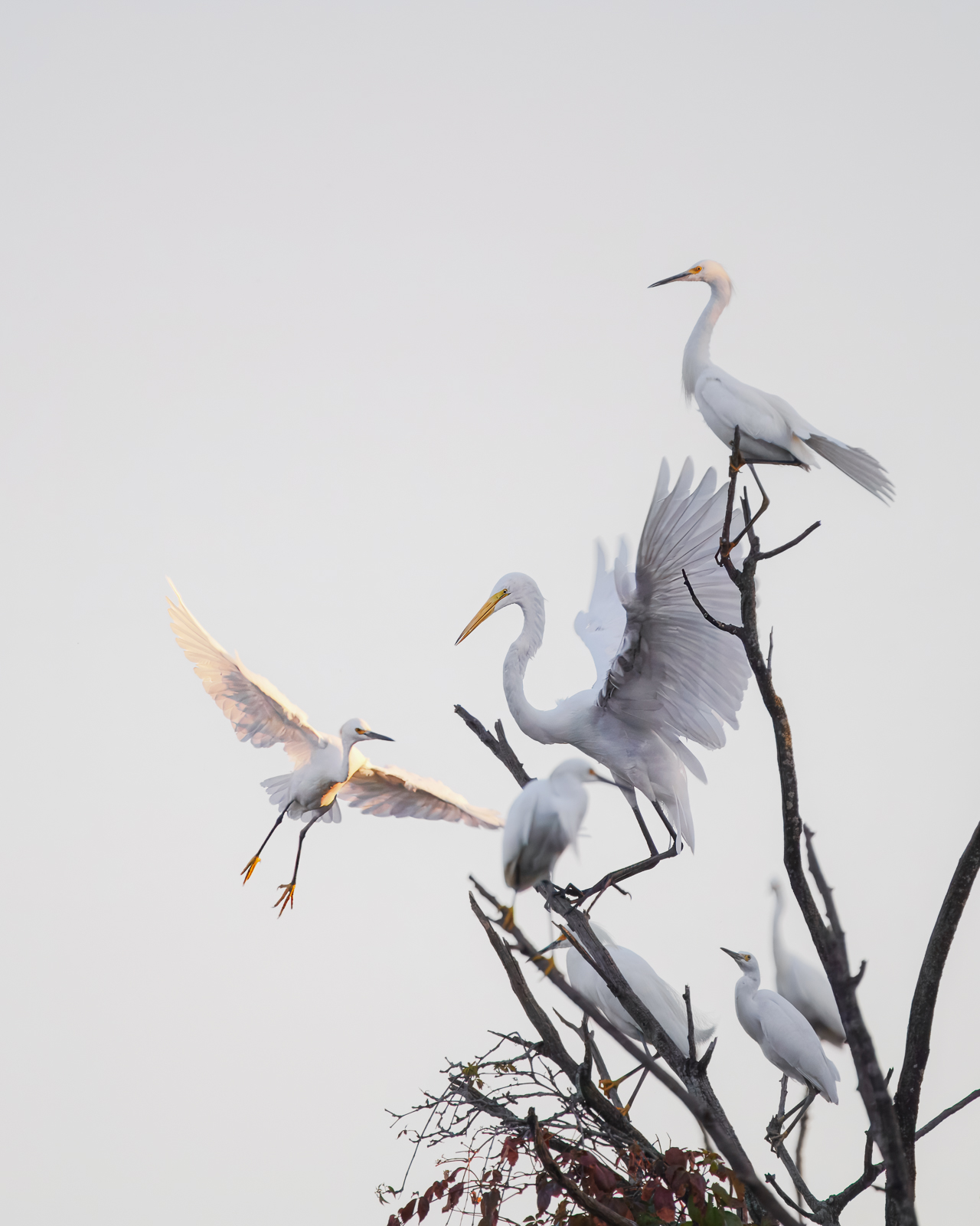 The egrets arrive as the sun dips low, claiming their spots and settling in during the last wisps of dusk. Disputes break out constantly in bursts of flurried wings, sharp squawks, and stabbing beaks. Chaos flares, then dissolves quickly.
